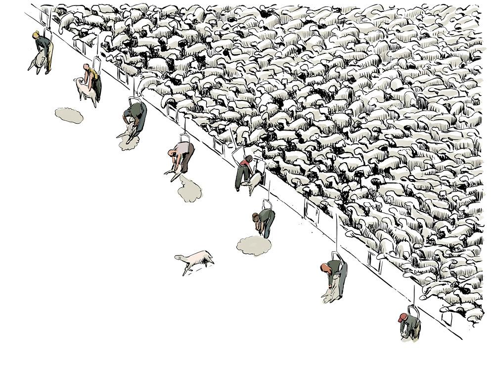 Récemment, et c’est une petite révolution silencieuse, un tondeur des Hautes-Alpes a produit des tableaux établissant des tarifs de manière à toucher un Smic horaire pour un·e tondeur·euse moyen·ne faisant cent mérinos par jour. Pour y parvenir, il faudrait faire grimper le tarif de pratiquement cinquante centimes par bête tondue. L’illusion selon laquelle la tonte rapporte beaucoup est due à des heures de travail non comptabilisées, comme le temps de trajet, l’affûtage, les prises de rendez-vous, la comptabilité2…